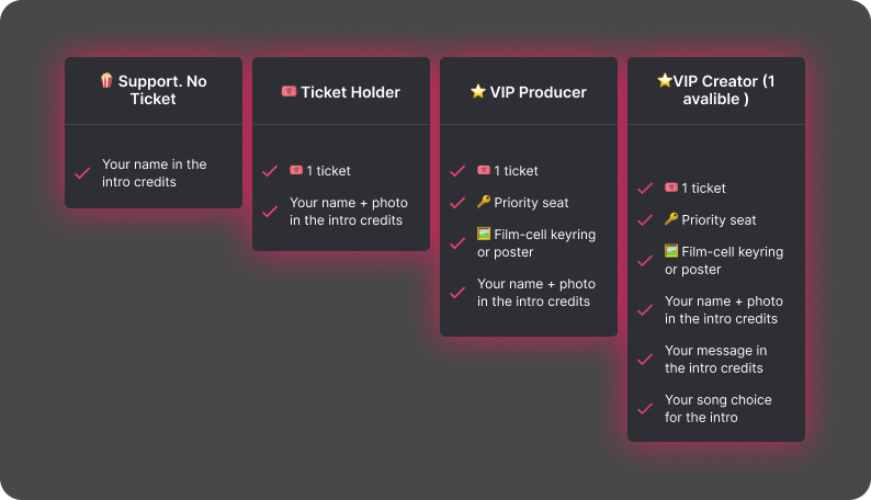 Each cinema has a different break-even point, so every screening has afunding target based on how many tickets are needed to unlock it. This keeps things realistic and fair for both the cinema and the audience.
